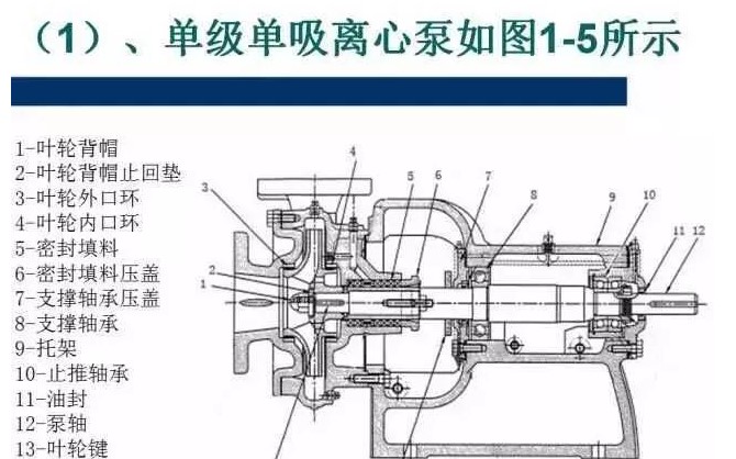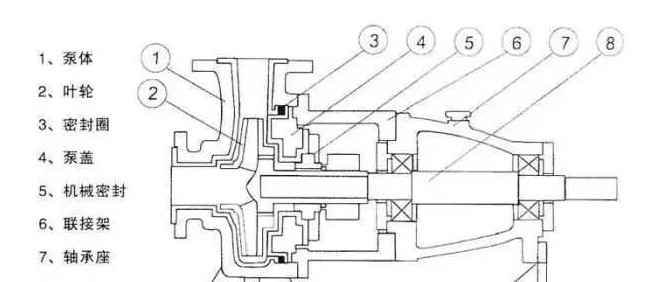離心泵的基本構(gòu)造是由八部分組成的,分別是:葉輪,泵體,泵蓋,擋水圈,泵軸,軸承,密封環(huán),填料函,軸向力平衡裝置。