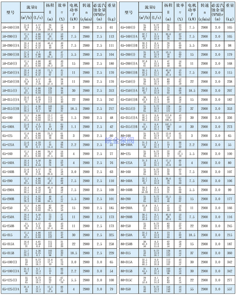 皖金泵閥不銹鋼臥式離心泵主要參數: