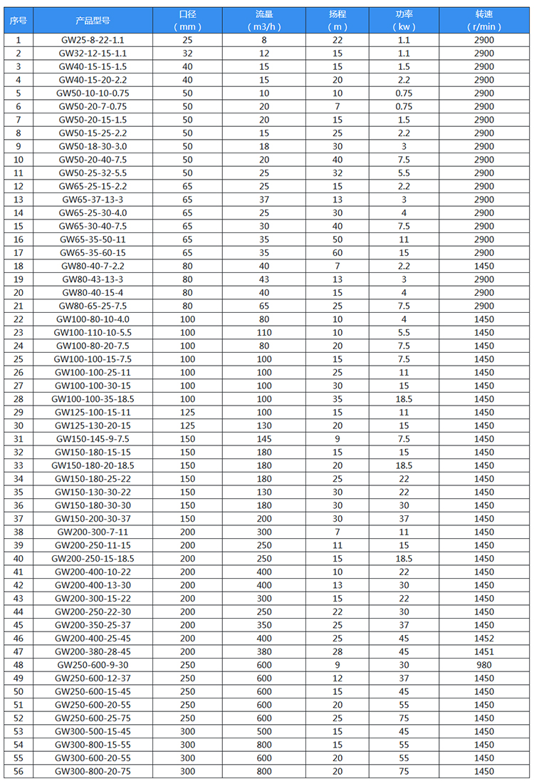 GW型管道式無堵塞排污泵是在成熟技術的基礎上,結合國內水泵的使用特點而研制成功的新一代泵類產品,具有節能效果好、防纏繞、無堵塞、自動安裝和自動控制等特點。在排送固體顆粒和長纖維垃圾方面,具有很好效果。